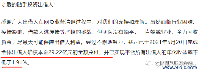 随后第32-39期兑付,是以逾期资产回款来兑付给出借人,之后不排除还会继续兑付。随手记全体出借人确权本金为29.22亿元,不仅本金全回,还实现平台所有出借人年化收益率不低于1.91%(目前已经超过2.26%),在出问题的平台中这家已经算比较良心了。