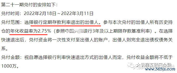 之后每月兑付1000万的收益,直至2022年3月第22期兑付开启“银行利率快速退出”通道。选择银行利率快速退出的,视为完全退出,出借人可以一次性拿到所有历史持仓的年化收益率2.75%(参考三年定期存款利率)。