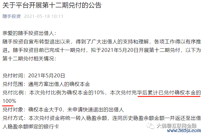之后每月兑付一期,直至2021年5月兑付第12期后,所有已确权的出借人已拿回100%的本金。